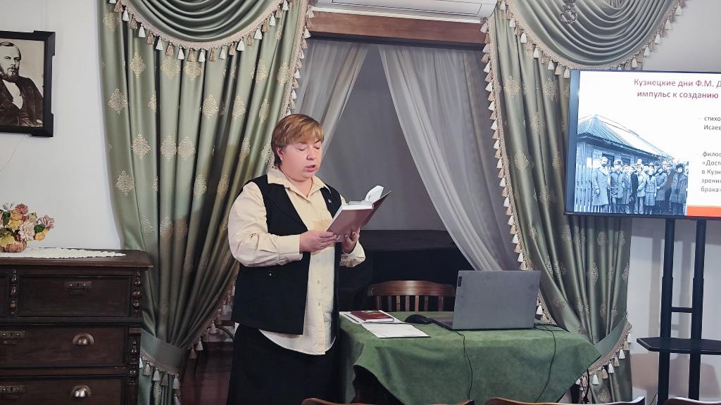 Присутствующие узнали, как наследие Достоевского отразилось в поэзии и прозе известной кузбасской писательницы в разные годы, какими творческими путями она шла к Достоевскому, в том числе – в период работы научным сотрудником музея. Переклички тем, мотивов, образов и интонаций, связывающих двух авторов разных эпох, попали в фокус лекционного разговора. Особое внимание было обращено на несколько произведений Любови Никоновой: эссе «Лик города» (1998), цикл стихотворений «Волна блаженства и волна страданья» (1987-1991), философский трактат «Достоевский и Исаева в Кузнецке…» (1991).