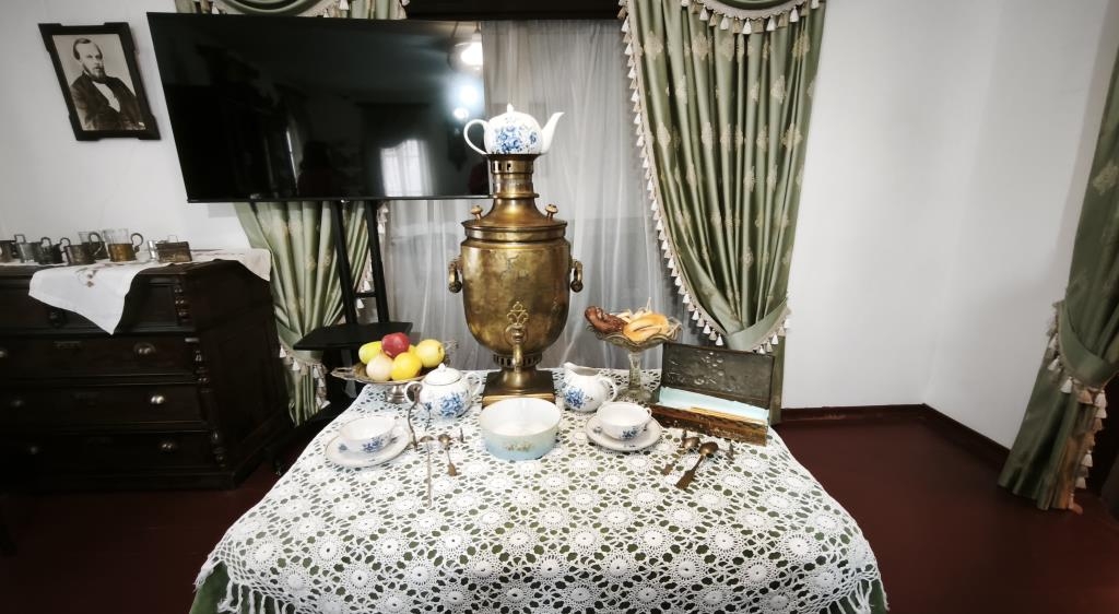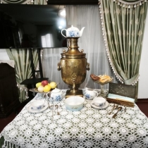 Гости с интересом осмотрели выставку чайных предметов конца XIX — начала XX века из музейных фондов. Центральным экспонатом тематической выставки стал самовар – символ старинной русской чайной церемонии. Много интересного присутствующие узнали о посуде: чашках, блюдцах, чайных и десертных ложках, чайнике, конфетнице и вазочках для фруктов и сладостей. Никого не оставила равнодушным коллекция подстаканников.