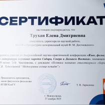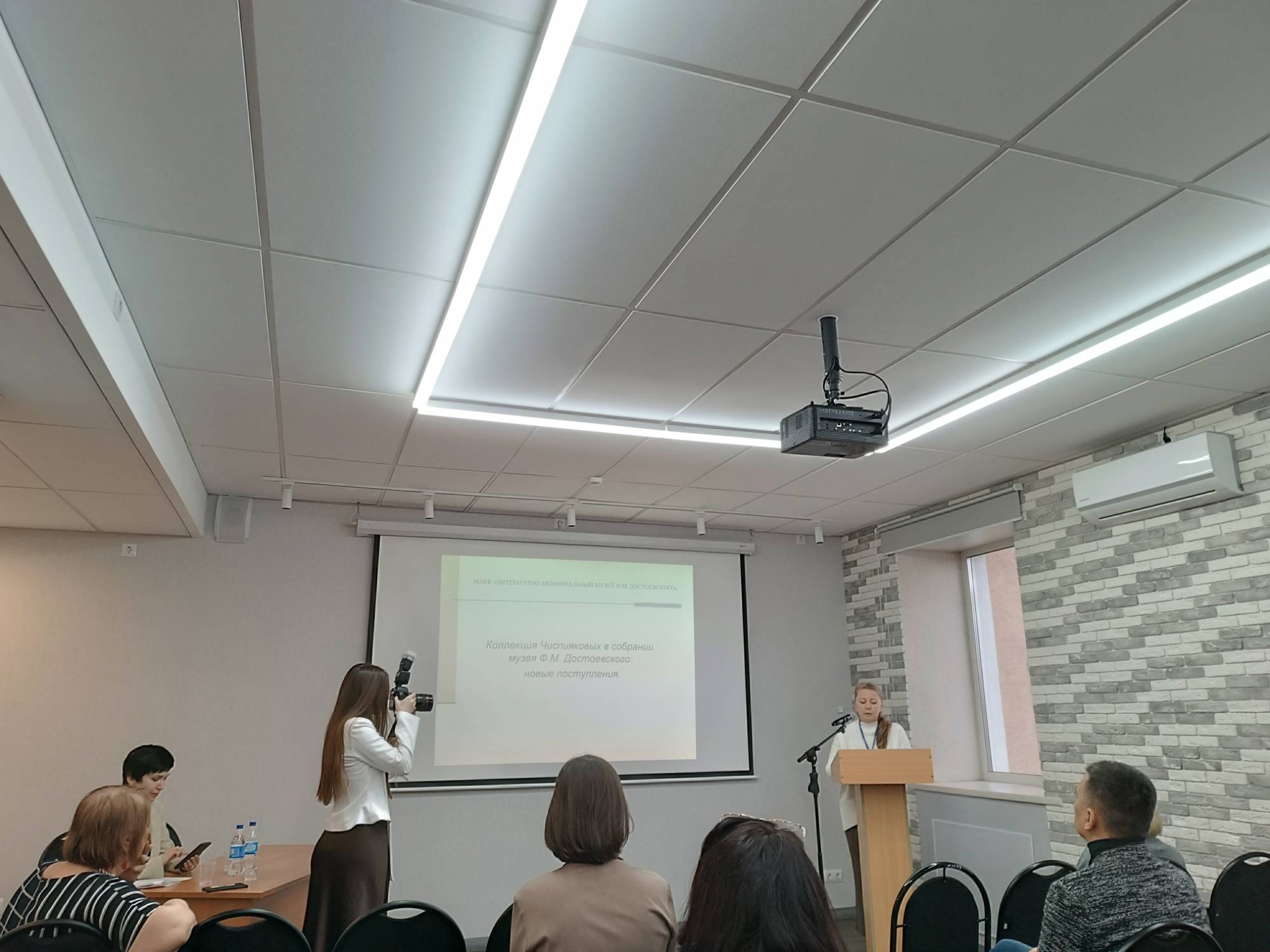 Главный хранитель музейных фондов Н.В. Караваева представила вниманию слушателей на пленарном заседании доклад «Коллекция Чиспияковых в собрании музея Ф. М. Достоевского: новые поступления». Заместитель директора по научной работе Е.Д. Трухан обратилась к теме «Поэтика названия стихотворного сборника Т.В. Тудегешевой "Медногривое солнце встает"» и поделилась результатами работы на секции «Актуальные проблемы исследования фольклора и литературы коренных народов Сибири, Севера и Дальнего Востока. Духовно-нравственные основы словесности».