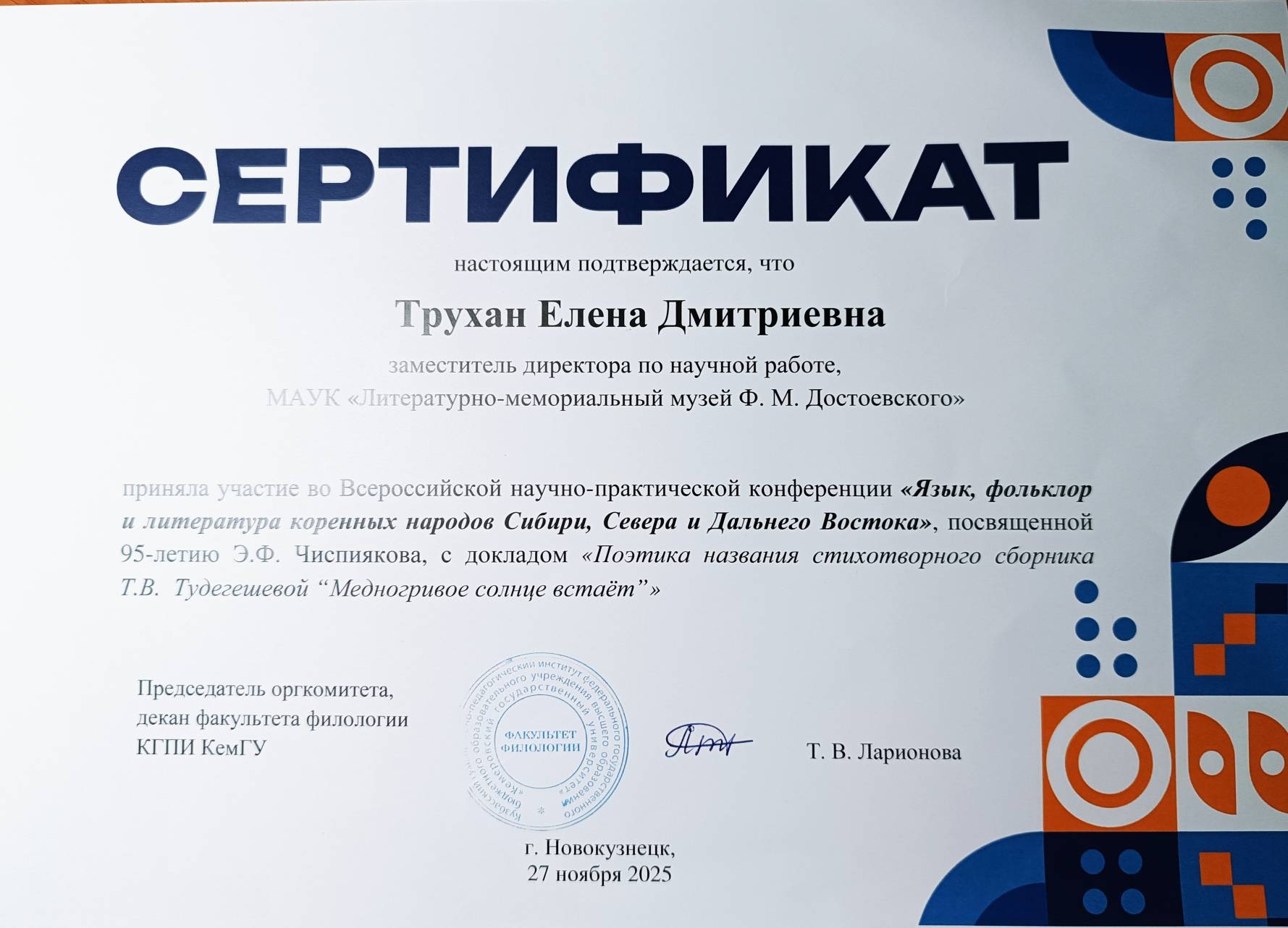 27-28 ноября 2025 года сотрудники Литературно-мемориального музея Ф.М. Достоевского приняли участие во Всероссийской (с международным участием) научно-практической конференции «Язык, фольклор и литература коренных народов Сибири, Севера и Дальнего Востока».