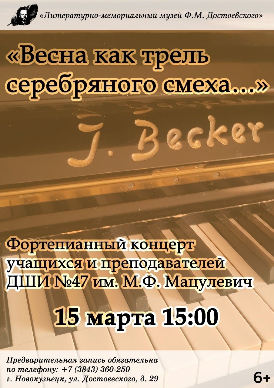 15 марта 2026 года вновь состоялась встреча любителей классической музыки в гостиной музея Ф. М. Достоевского. В этот раз к старинному роялю прикоснулись руки педагогов и учащихся Детской школы искусств № 47 имени М. Ф. Мацулевич. Программа концерта называлась строкой Анны Ахматовой «Весна как трель серебряного смеха…», и хрустальные звуки уникального инструмента действительно напоминали то нежный щебет птиц, то звонкое журчание ручья, то смелую дробь весенней капели.