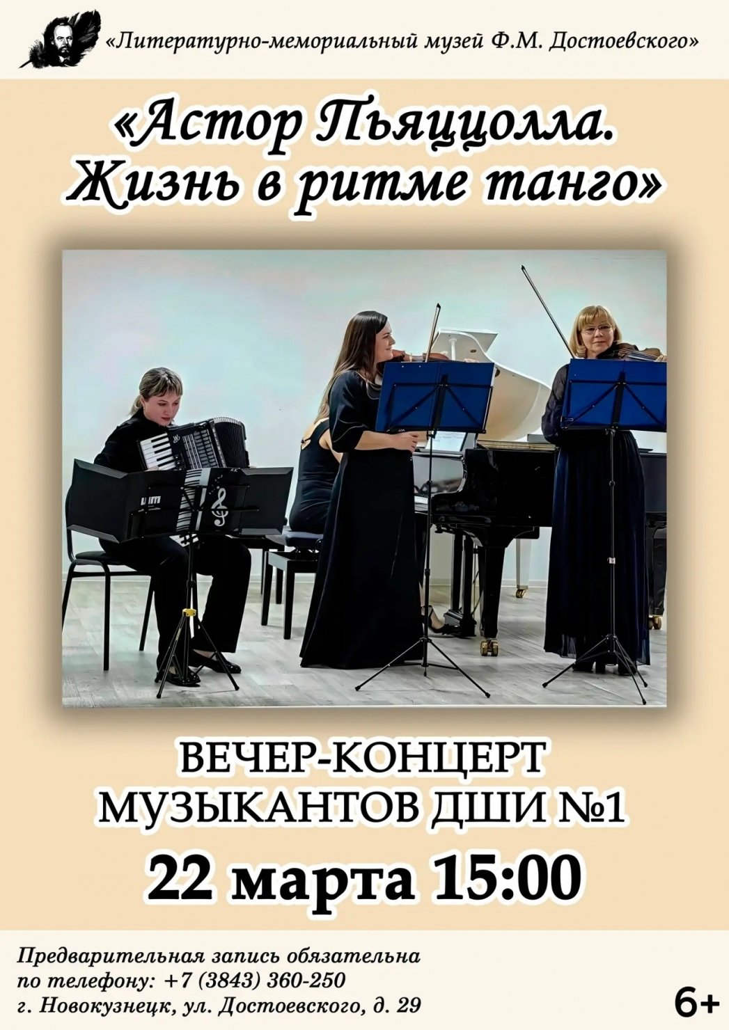 22 марта 2026 года в гостиной Литературно-мемориального музея Ф. М. Достоевского прозвучал пятый концерт нового проекта «В красоте музыкальности…» – «Астор Пьяццолла. Жизнь в ритме танго».