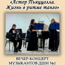 На концерте «Астор Пьяццолла. Жизнь в ритме танго» своё творчество представили музыканты Детской школы искусств №1: Маргарита Синюгина (скрипка), Марина Лепикова (рояль), Марина Басалгина (скрипка), Екатерина Рукина (рояль), Наталья Кокина (рояль), Юлия Котельникова (аккордеон), Татьяна Павлова (автор сценария и ведущая программы). Прозвучали не только известные во всём мире шедевры аргентинского композитора второй половины XX века, родоначальника стиля «новое танго» Астора Пьяццоллы («Libertango», «Adiós Nonino», «Времена года в Буэнос-Айресе», «Oblivion»), но и эмоциональный, захватывающий рассказ Татьяны Павловой о его драматичном жизненном пути, ошеломляющем успехе произведений и долгожданном признании на родине.